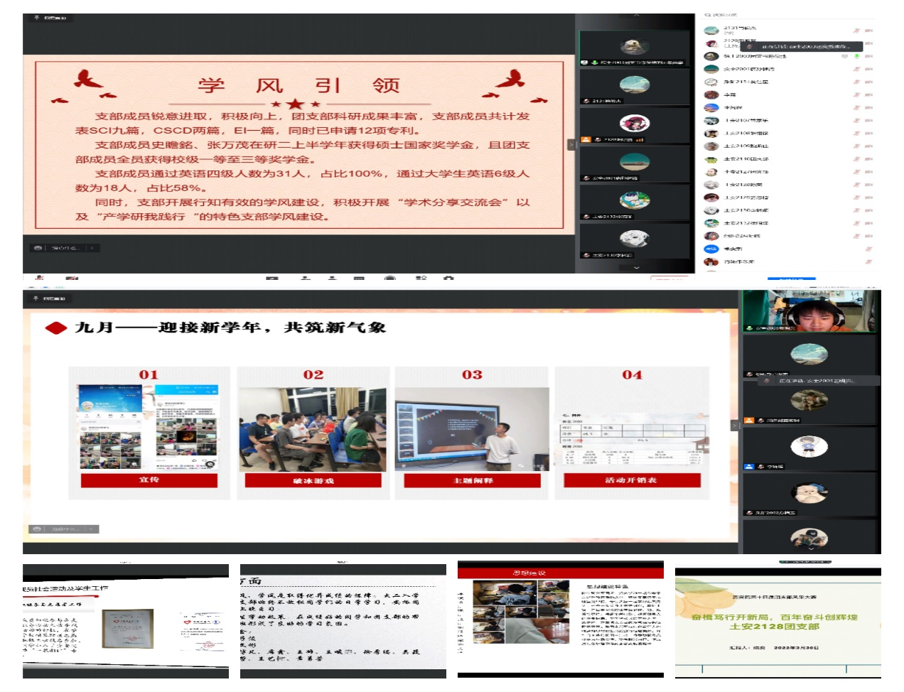 本次大赛主题为“奋楫笃行开新局,百年奋斗创辉煌”,共分为现场答辩和评委提问两个部分。22支团支部队伍幷驱争先,在答辩的五分钟时间内,展现各支部的风采。虽然受疫情影响,团支部无法现场展示自我,但是通过图文和视频,评委老师和各位同学也能深切感受到各团支部的活力和凝聚力,展示出公司基层团支部健康、积极、乐观、向上的形象。各团支部主要就支部基本情况介绍、组织建设活动、学风建设、社会实践活动四个方面进行汇报,同时结合各支部特点进行延展、创新,充分展现了青年团员组织生活的能动性和创造性。答辩结束后,评委老师就各参赛团支部的自荐材料与答辩情况进行提问,充分发掘了各团支部风采活力。