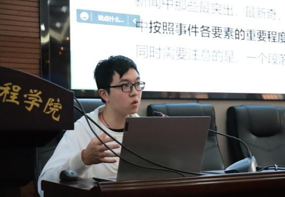 会议第一部分,由邹景煜同学讲解新闻稿的撰写,他分别从新闻的基本概念、新闻消息、新闻通讯以及注意事项四个方面展开讲解。在讲解过程中,他通过新闻稿修改案例和优秀新闻稿案例的展示,以理论和实际相结合的方式来帮助同学们更好的理解讲解内容。此外,他还着重强调了灵活使用长短句以及选择合适的配图的重要性。