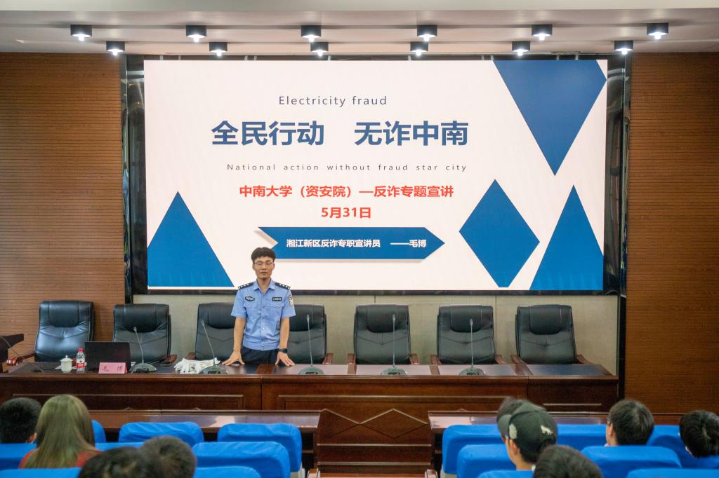 2023年5月31日下午,bv伟德国际2023年度资助诚信及安全教育主题宣讲活动于采矿楼T302胜利召开。此次活动由湘江新区反诈专职宣传员毛博警官主讲,本科生2022级辅导员及院资助专干陈一戈老师主持。