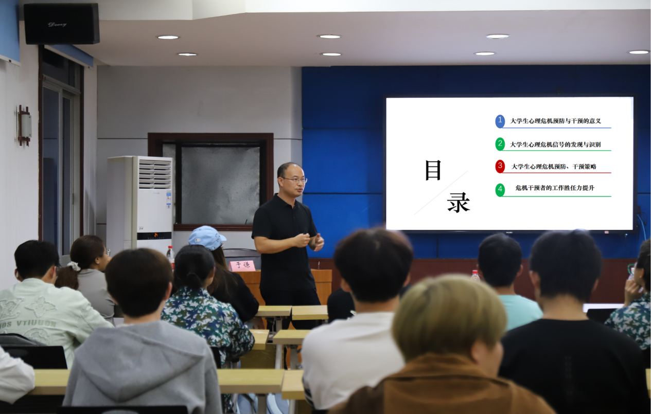 会议伊始,于谦老师以老员工常见的心理问题为切入点,强调朋辈互助的重要意义,并详细解读了危机信号识别、预防与干预策略、应对能力提升方法等,提出要通过构建和巩固好“校-院-班-寝”四级防护体系,筑牢朋辈互助防线,维护校园安全稳定。