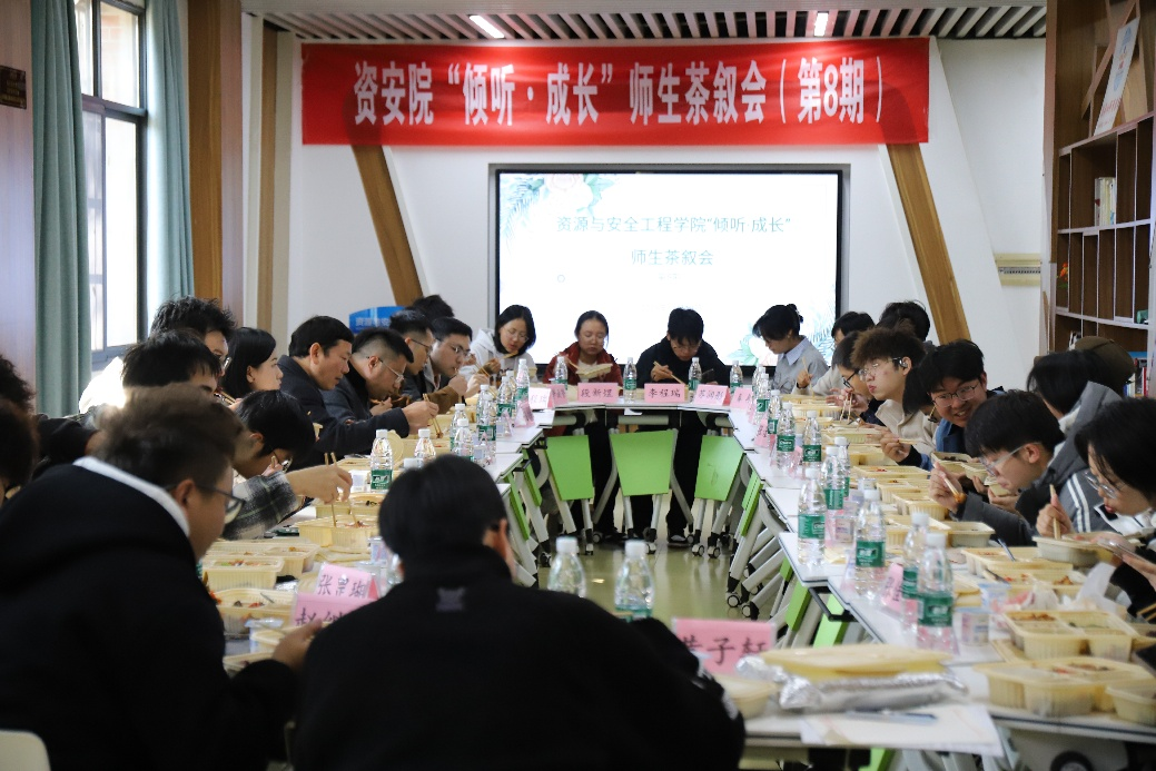 为增进师生交流,助力新生深入了解专业发展,促进班级建设与员工干部能力提升,11月19日中午,bv伟德国际1946在采矿楼懿德馆举办“倾听·成长”师生茶叙会(第8期)。公司党委副书记岳龙,安全系李孜军教授、采矿系李帅教授、城地系吴金标老师、班导师代表韩震宇老师,以及全体本科2025级新生班长、团支书、副班长共同参与。活动由辅导员黄佳星老师主持。