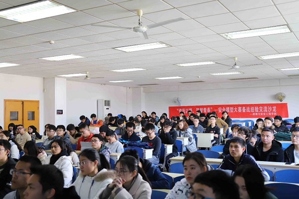 交流会首先由2016级安全工程优秀员工,全国高校安全科学与工程老员工实践与创新作品大赛一等奖获得者王渊洁发言,他从自己宝贵经验和心路历程出发,分享了作品大赛整个环节的故事和点滴,同时在整个发言的过程中,向同学们重点的讲解了团队组建,确定题目,补充说明等重要环节。与会同学被王渊洁轻松的言语所感染,现场互动频繁。最后,王渊洁提醒同学们要勇敢探索,不忘初心,要做到积极与老师沟通交流,同时鼓励大家积极参加本届大赛。