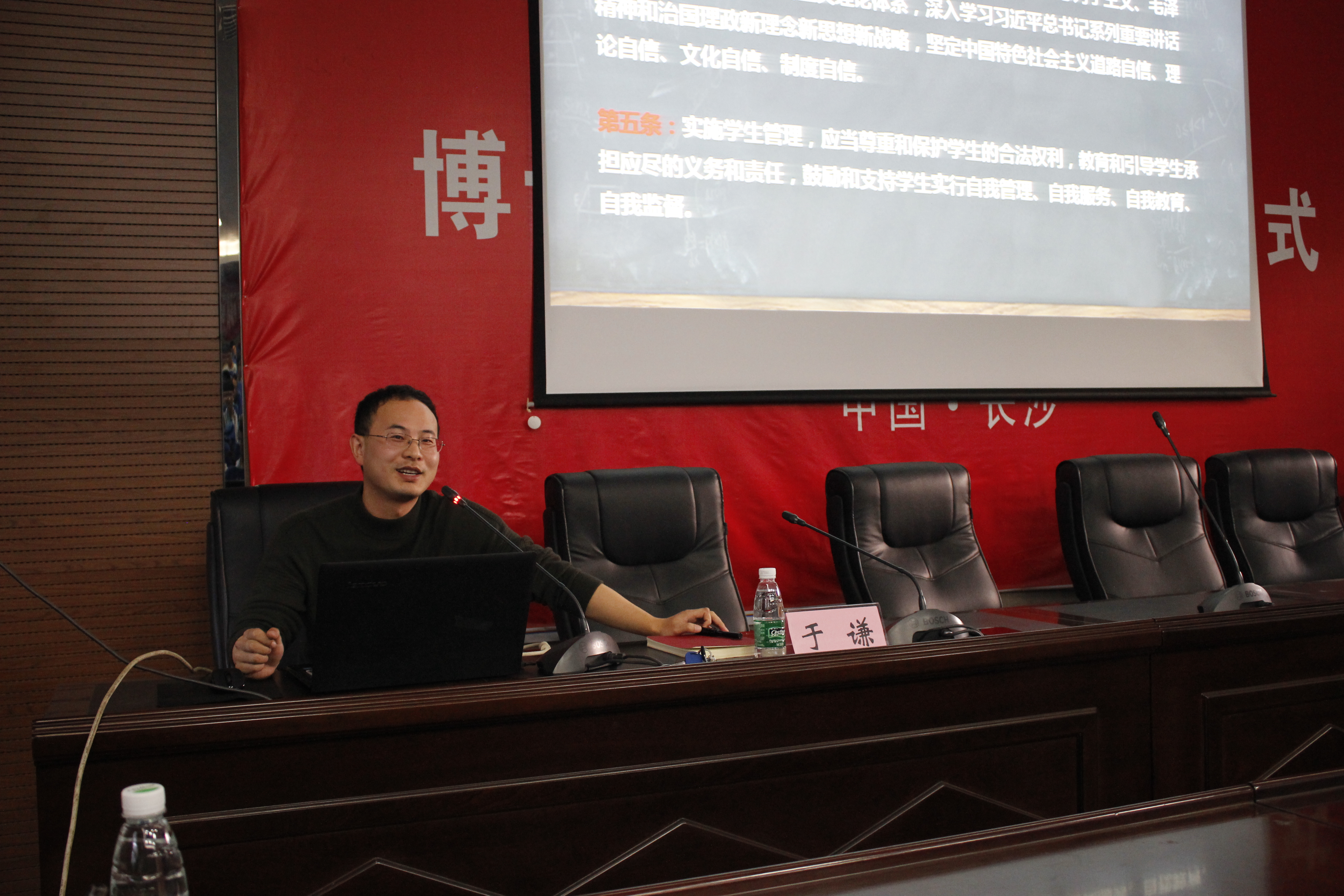 首先,在校纪校规方面,于老师请在座各位研究生齐声诵读《高等公司员工行为准则》里的八条规定,接着解释了bv伟德国际1946的校训、校风,诠释了社会主义核心价值观及《普通高等公司员工管理规定》的各项义务及要求,并希望在座的各位同学要谨记于心,恪守规章,做一个合格的中南人。此外,于老师特别强调了树立程序意识与规则意识的重要性。