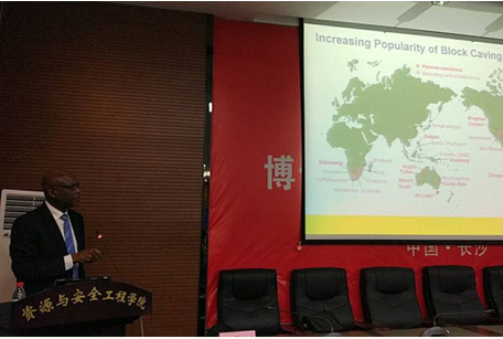 10日上午Fidelis T Suorineni教授带来了两场学术报告,主题分别为Hypothesis for effective hydraulic fracturing in crystalline rocks和Effective hydraulic fracturing in crystalline rocks as applied to block cave minmg preconditioning and reactivation of stalled caves。教授主要介绍了他在岩石崩落法研究中取得的最新成果,并向同学们阐述了“水力压裂裂纹”问题研究中的应力阴影效应及定向水力压裂等理论。随后,他的员工何青源博士就其团队研究内容进行了拓展补充。11日上午,Fidelis T Suorineni教授围绕主题:Shear loading Of orebodies—The unrecognized threat to safe and productive mining,并结合其科研团队设计的工程实验为同学们详细演示了工程实践中矿柱尺寸设计的各项理论与影响因素。