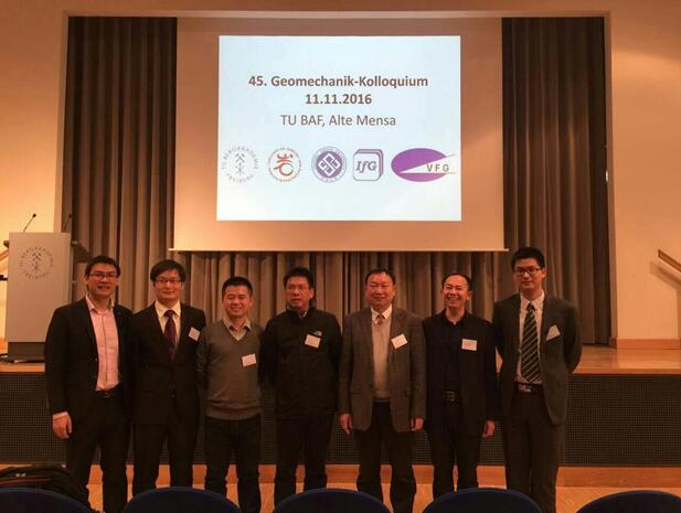 2016年11月9日至12日,由德国弗莱贝格工业大学与公司合作主办的第45届国际地质力学研讨会(The 45th Geomechanics Colloquium)在德国弗莱贝格市举行,本届会议合作方还包括莱比锡地球力学研究所(Institute of Geomechanics GmbH Leipzig)和弗莱贝格岩土力学协会(Verein Freiberger Geotechniker),来自德国、中国、美国、英国、瑞典、奥地利、俄罗斯、捷克等十几个国家的130余名代表参加了会议。公司派出了由曹平副经理、周科平教授、黄仁东教授、林杭副教授和李响讲师5人组成的代表团赴德国进行本次会议的组织与协调工作。林杭副教授和李响讲师分别在会议上作了大会学术报告,获得了广泛的关注与好评,并与参会人员就关心的问题进行了深入的讨论。公司派出的正在德国弗莱贝格工业大学攻读博士学位研究生党文刚和联合培养博士研究生戴兵也参加了本次会议。