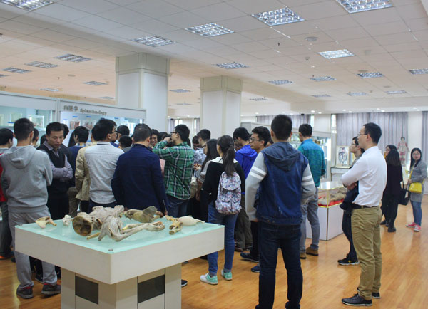 全体研究生新生在讲解员的带领下有序进入展馆进行参观。讲解员首先对展馆入口处代表人类生命孕育的工艺品进行了介绍,指出了我们本次活动的主旨是“生命 感恩”;随后,讲解员为大家分别介绍了生命从受精卵开始直至出生几个不同发育阶段的人体胚胎标本,让大家具体了解到一个生命在母体内是如何发育生长的;最后,讲解员向大家介绍了展馆内不同人体组织系统的病变器官的形态及其病变缘由,这些组织系统包括消化系统、泌尿系统、呼吸系统、生殖系统等。