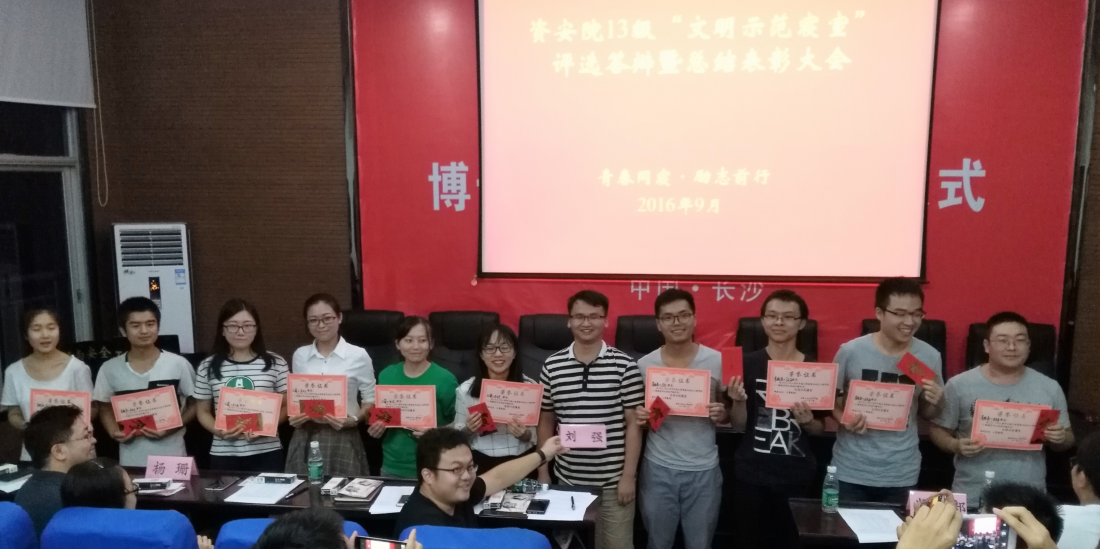 2016年9月10日晚7点30分,资安院13级“文明示范寝室”评选答辩暨总结表彰大会在校本部采矿楼302举行。13级班导师彭述权老师、杨珊老师,学工办主任李欢老师、辅导员朱玮老师、刘强老师以及优秀员工代表到场参会并担任评委。