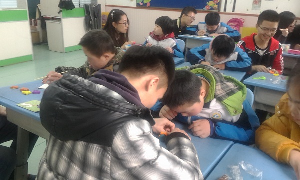 下午一点左右,“爱心特教队”在资安院文法楼下集合乘车前往位于长沙市汽车西站附近的长沙市特殊教育公司。经过校方安排,队员分为两组,分别前往培17班与培18班,努力用互动游戏真诚地感染这20几位小朋友们。17班的教室里,小朋友们开心地进行自我介绍,并与一队队员开展“一对一”或“一对二”的活动:拼图游戏、橡皮泥塑形、彩色画、折纸、亲密合影。18班在操场上,与二队队员一起上着他们的室外课,一阵阵欢笑飘扬,一片片童真荡漾。公司的老师们看在眼中,向队员们表示感谢与赞扬,并希望他们以后有机会还能再来。一位殷姓老师说:“你们来过一次,孩子们都会记得,会念着你们想着你们。”