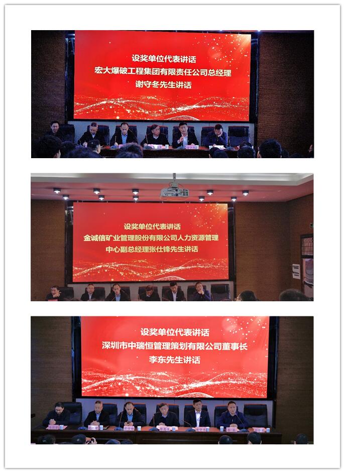 宏大爆破工程集团有限责任公司总经理谢守冬先生、金诚信矿业管理股份有限公司人力资源管理中心副总经理张仕锋先生和深圳市中瑞恒管理策划有限公司董事长李东先生分别代表设奖企业发言。他们首先向所有获奖的员工表达了衷心的祝贺,然后深情地谈到了自己或单位与bv伟德国际1946的情感渊源,高度肯定了bv伟德国际1946各方面所取得的巨大成绩,表示设立奖励金助力教育事业的发展是企业义不容辞的责任,他们勉励大家:要再接再厉,力争上游,还要提高眼界,放眼全球,更要不忘初心,报效国家。同时还表示大家要同企业保持联系,加强交流。