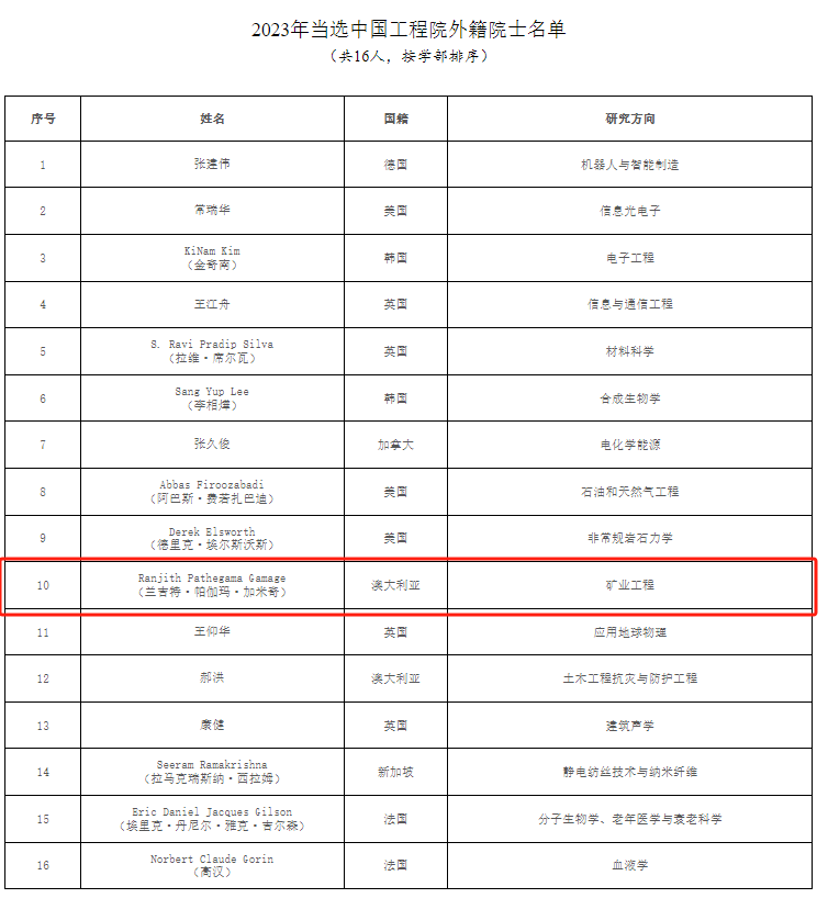 https://www.cae.cn/cae/html/main/col1/2023-11/23/20231123090056741245109_1.html。此次产生了16位外籍院士,其中包括澳大利亚莫纳什大学教授、bv伟德国际1946名誉教授Ranjith Pathegama Gamage(兰吉特·帕伽玛·加米奇)。Ranjith Pathegama Gamage 教授以其杰出的学术成就和卓越的贡献荣获这一殊荣,他同时是莫纳什大学和bv伟德国际1946的杰出代表。他的加入进一步丰富了中国工程院的国际化视野,也为中国工程科技发展注入了新的智慧和动力。