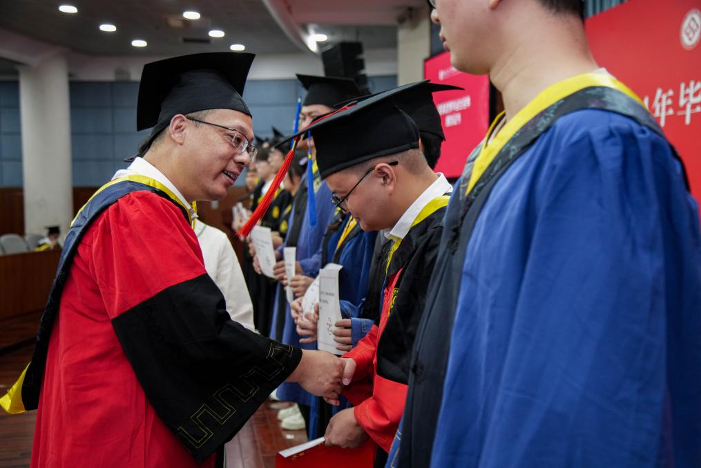典礼结束后,学位授予仪式正式开始。毕业生们身着学位服有序上台,依次接受学位授予。公司老师们为获得学位的毕业生正冠拨穗,握手道贺,并共持学位证书合影留念。
