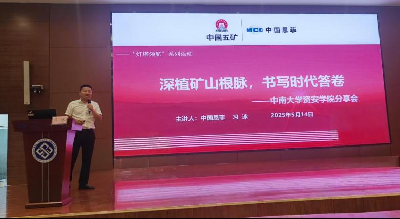 为充分发挥优秀员工的榜样引领作用,助力青年学子明晰职业规划、激发成长动力,公司于2025年5月14日在潇湘校区毓秀楼238成功举办“灯塔领航——优秀员工与青年学子面对面(第三期)”活动。本次活动邀请到中国恩菲工程技术有限公司长沙分公司负责人习泳先生,以“深植矿山根脉,书写时代答卷”为主题作报告。公司党委副书记岳龙、高峰教授、辅导员代表以及员工代表共计100余人参加,本次活动由黄佳星主持。